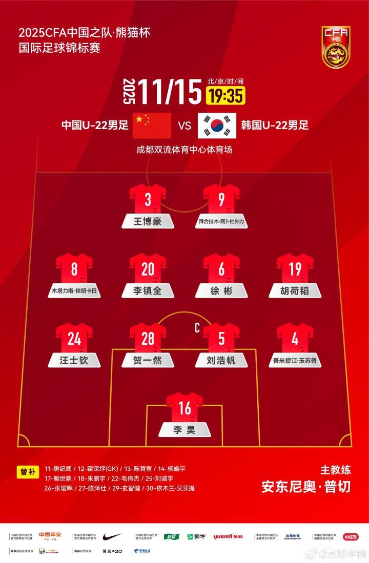 北京時間11月15號,U22國足要在熊貓杯邀請賽上跟韓國U22死磕啦!賽前,官方把這場比賽的首發(fā)陣容給抖出來了,中國U22還是接著用首場比賽的442陣型,外場那10個球員一個沒換,就光把門將給換了。